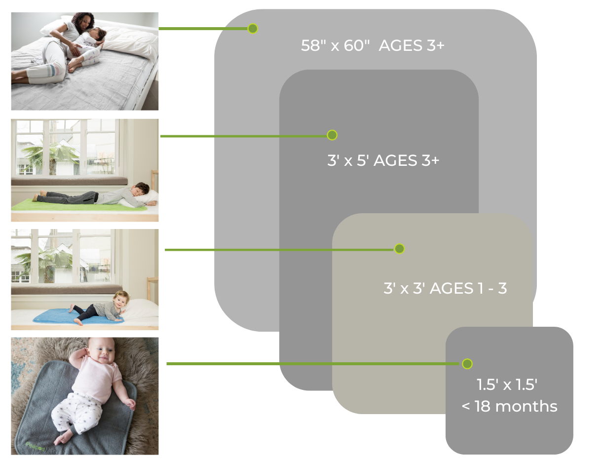 Find the best kids pee pad for your needs. Please keep in mind, these are only suggestions to help you find the right bedwetting solution. Factors to consider are the size and age of the child, as well as movement in bed and size of bed. Whichever PeapodMat size you choose, we highly recommend that the bedwetting pad be placed slightly under the pillow.